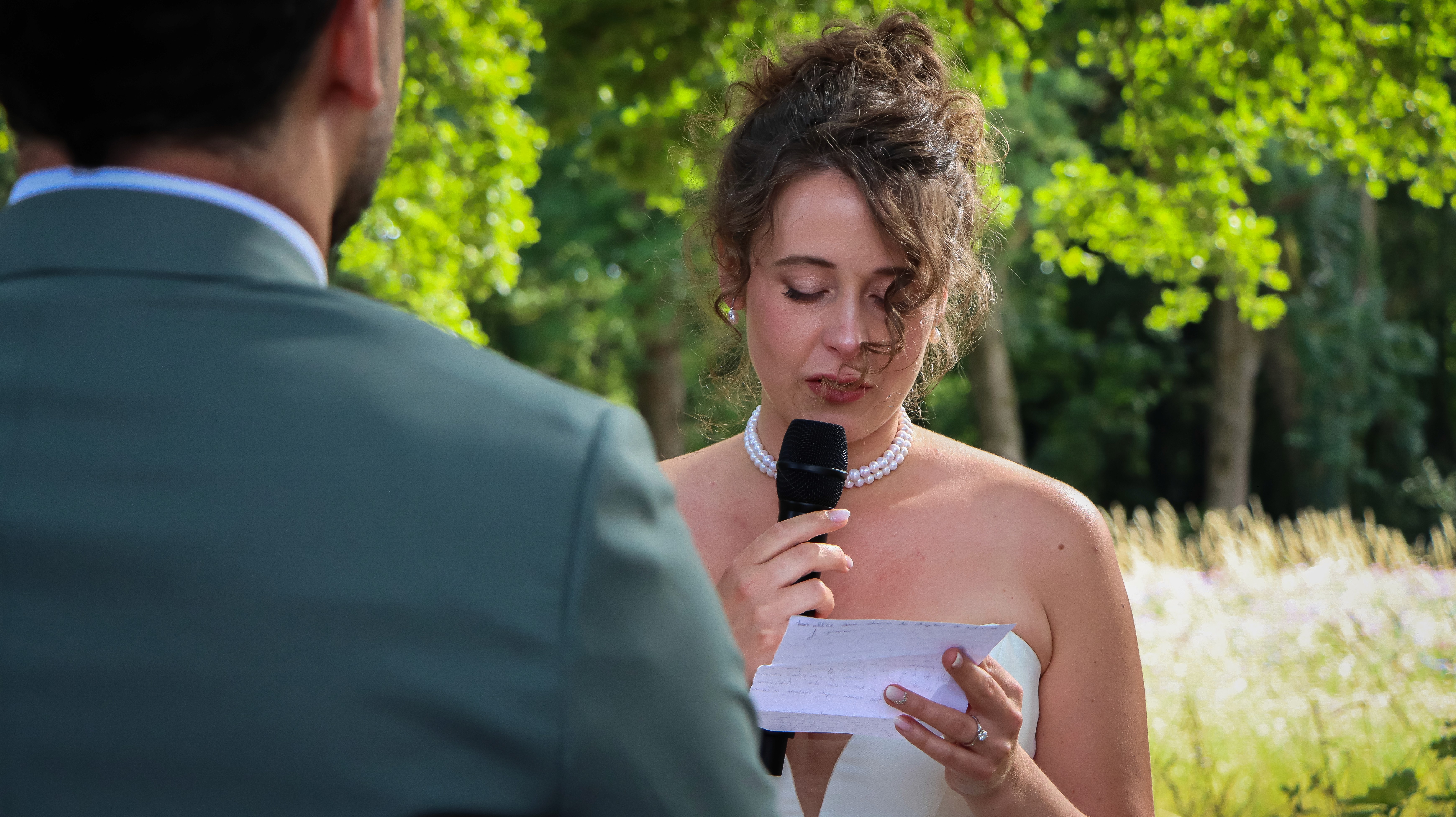 Leur journée a commencé dans la douceur des préparatifs, entre rituels partagés, émotions contenues et premiers éclats de rire. Puis, au milieu du domaine, une cérémonie laïque profondément sincère a réuni leurs proches : un moment suspendu, bercé par la lumière, les mots et l’intimité du plein air.